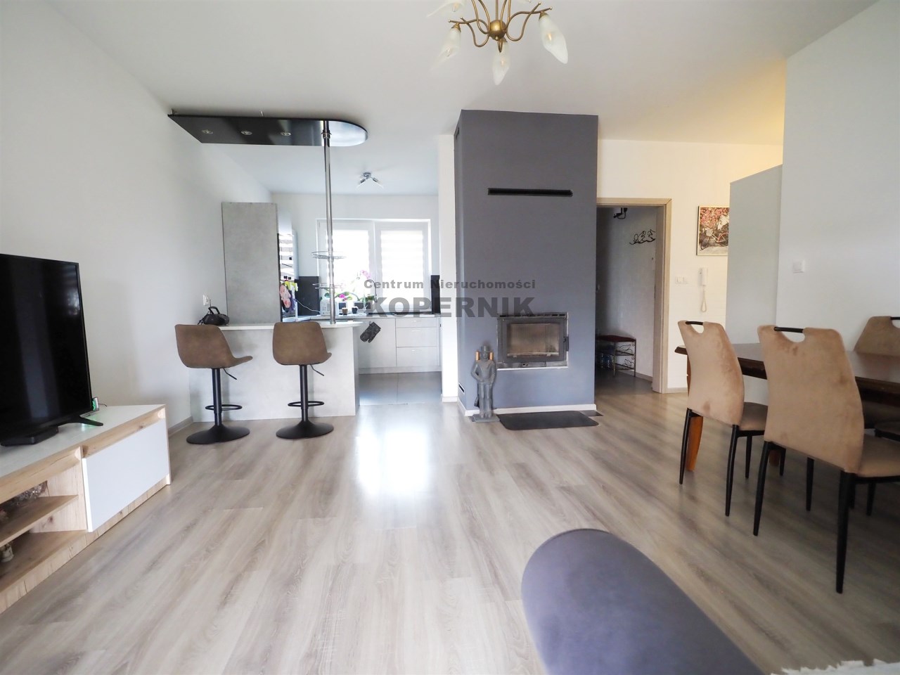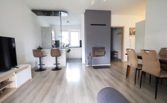 W salonie znajduje się kominek który zimą idealnie ogrzewa calutki dom - na drewno.
