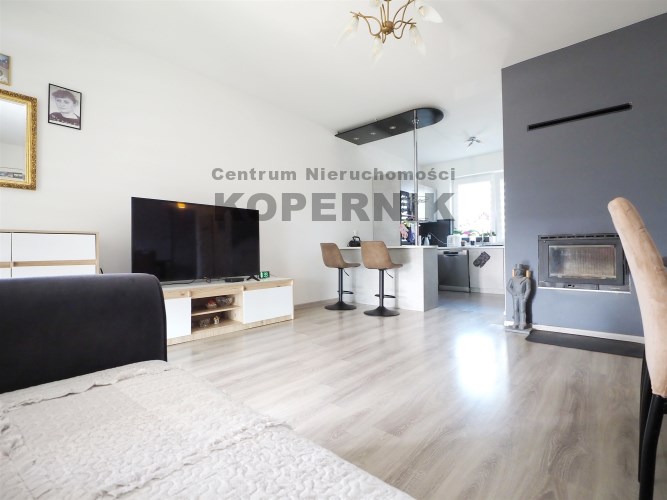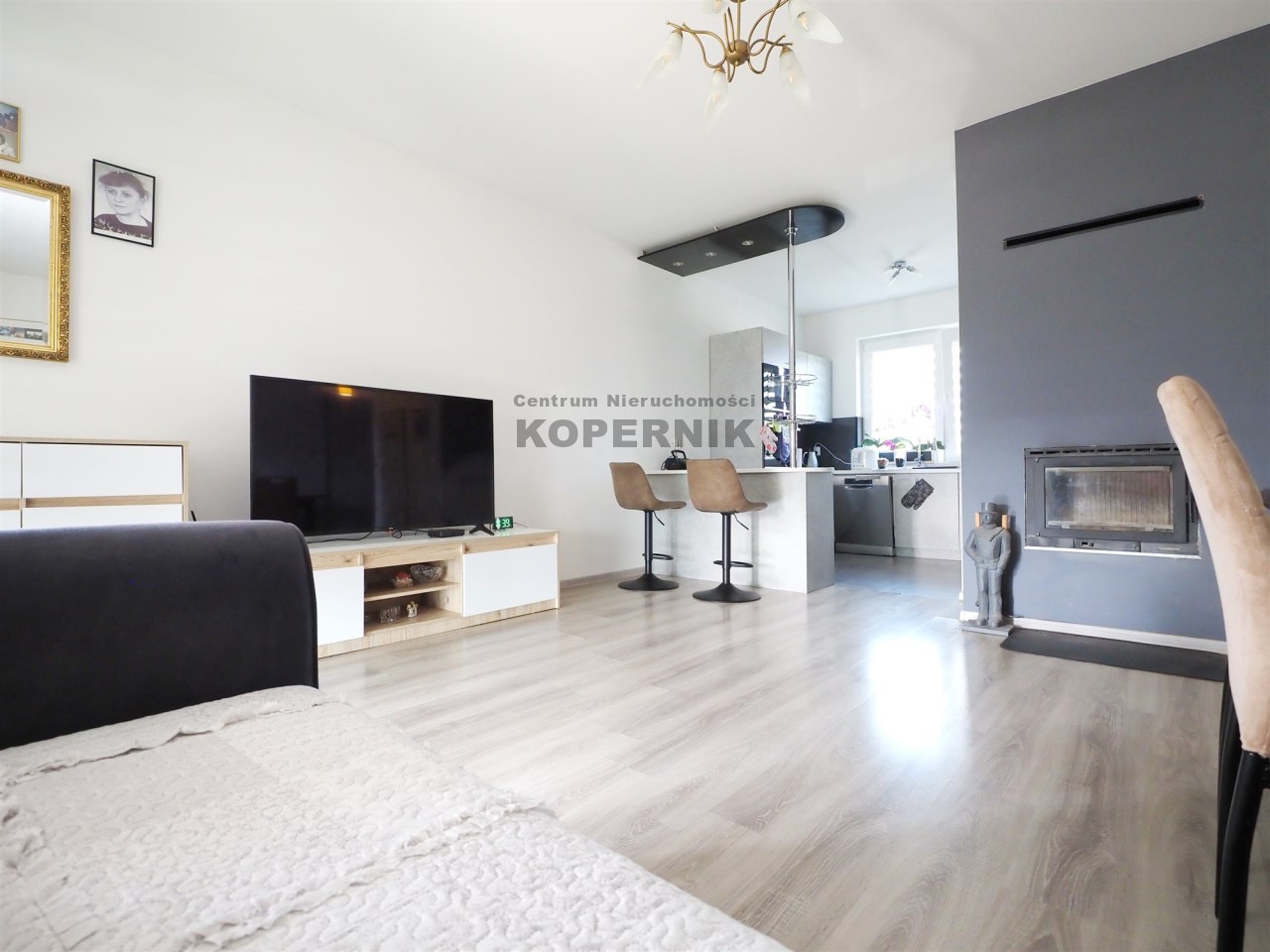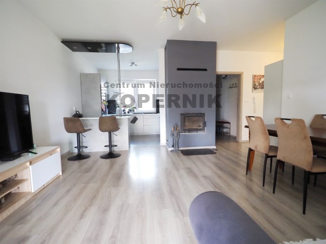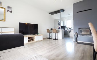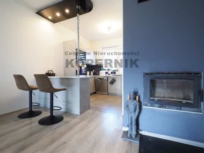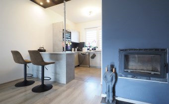 W salonie znajduje się kominek który zimą idealnie ogrzewa calutki dom - na drewno.