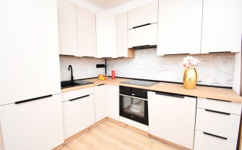 W salonie znajduje się nowoczesna kuchnia w eleganckim kolorze kaszmir, wyposażona w sprzęt AGD: - zmywarka - lodówka - płyta indukcyjna - okap