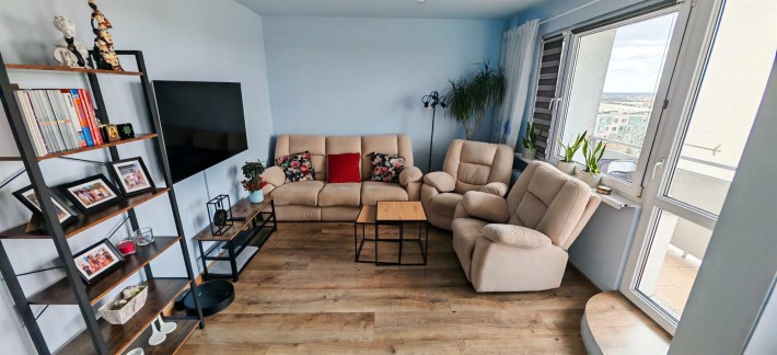 - salon z wyjściem na duży BALKON typu LOGGIA od zachodniej strony - rozpościera się tu przepiękny widok na nowy most, widać nawet wieże kościołów Starego miasta. Salon jest sercem domu , nie ma tu drzwi, jest otwarta przestrzeń, wpada dużo światła do środka.
