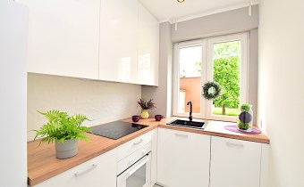 - w wyposażeniu m.in. pralka, lodówka z zamrażarką, zmywarka, mikrofalówka, TV, odkurzacz, deska do prasowania