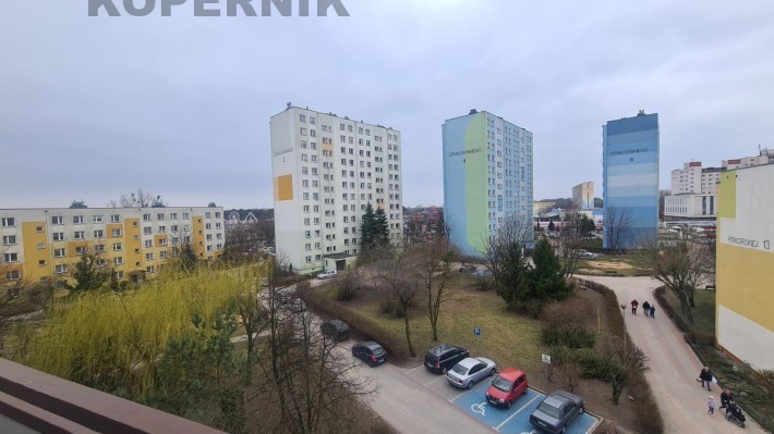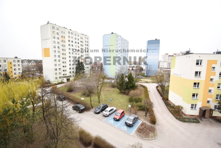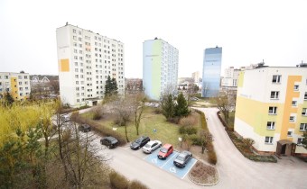 na czwartym piętrze w niskim bloku z widokiem na zieleń.